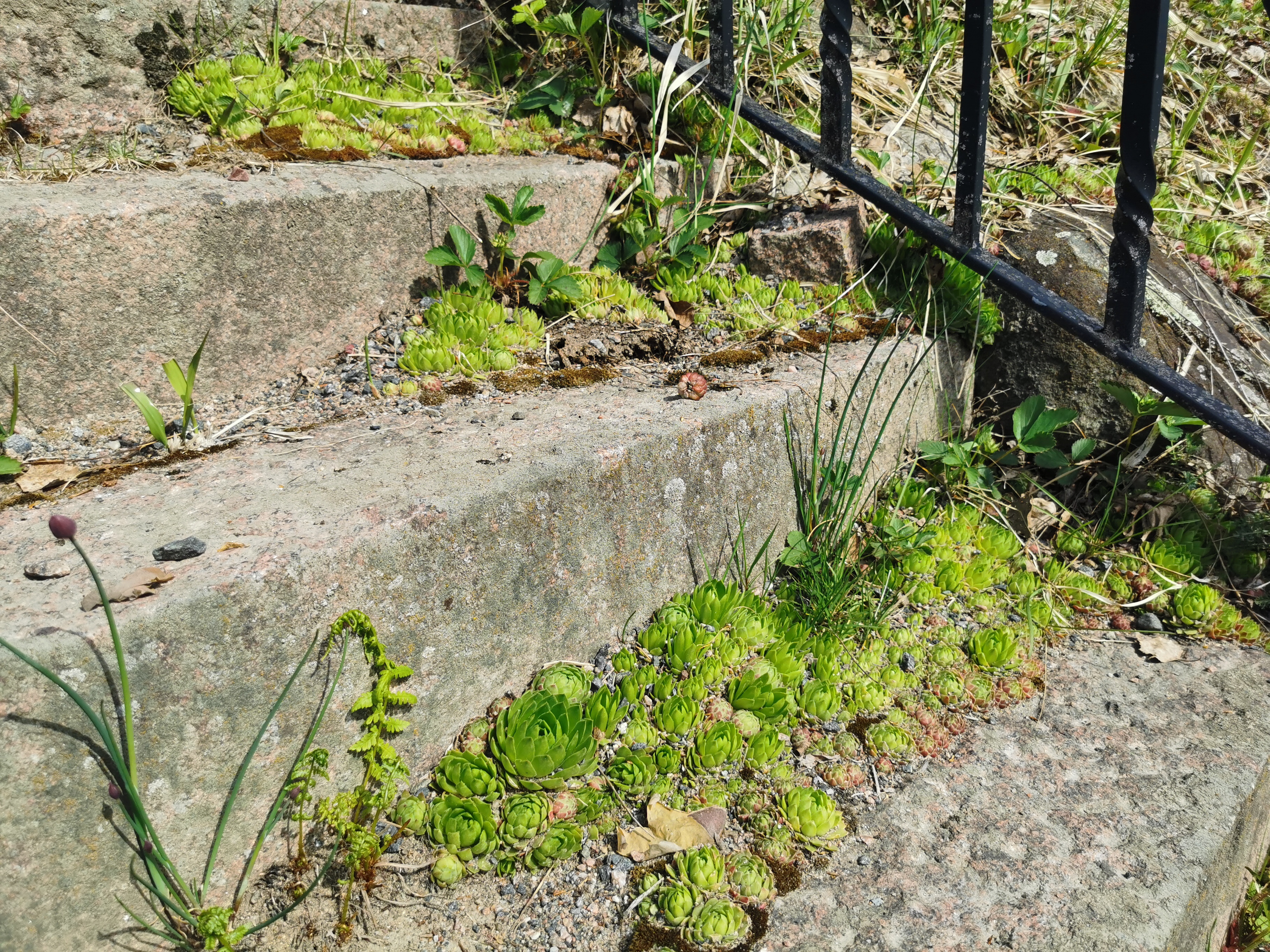 Nyt kivien väleissä ja päällä kasvaa monenlaisia kasveja, eniten ruoholaukkaa, sammalleimua, mehikasveja ja ukkomansikoita. On vaikea sanoa, rakastanko enemmän kiviportaita, kaidetta vai noita kasveja. Ei, rakastan sitä kokonaisuutta. Joku toinen haluaisi varmaan päästä vähällä ja myrkyttäisi kaikki kasvit. Minulle sellainen ei ole mitenkään mahdollista. Niinpä katselen kivien kohoilua ja asettelen askeleeni portaissa niin, etten tallaa kukkia tai potki mansikoita.